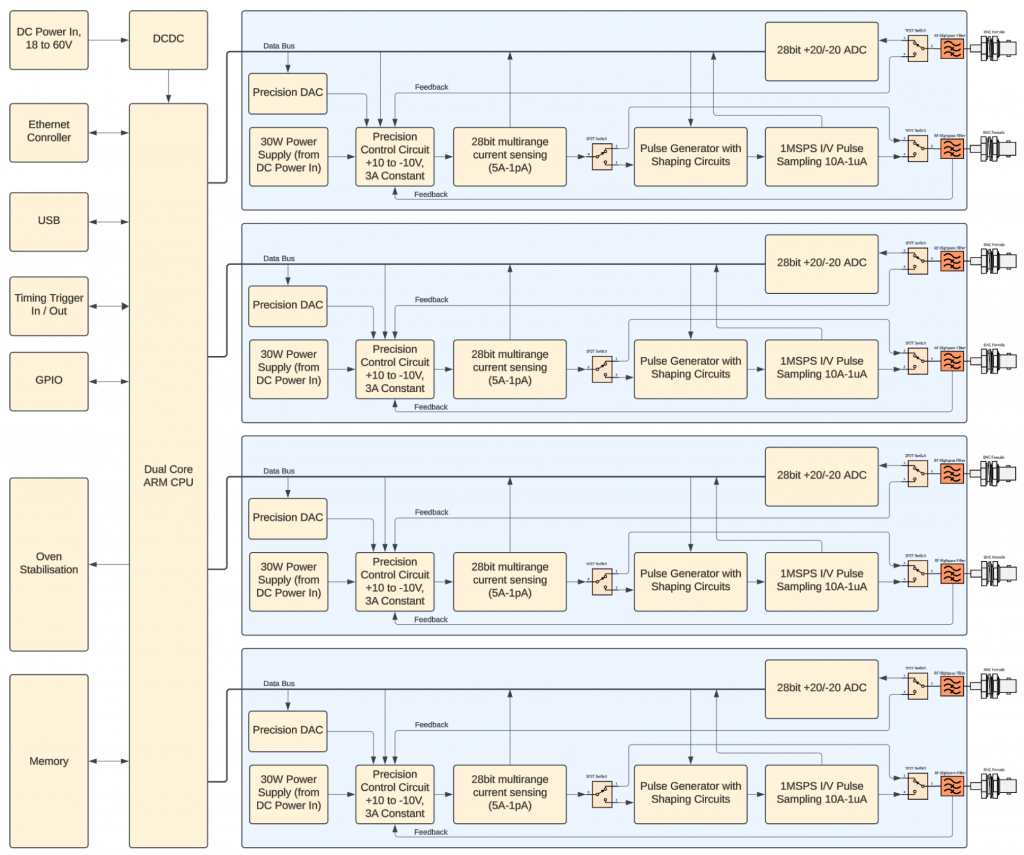EECL’s Advanced Source-Measure Unit (SMU) is a 4-channel SMU, with ±10V outputs, capable of 3A per channel. With ±20V input sense channels, down to 10pA current sense precision, fast-sampling modes, and pulsed modes with adjustable durations and rise/fall times, the SMU offers a one-product solution for even the most complex measurement problems in semiconductor device characterization, quantum computing, etc.