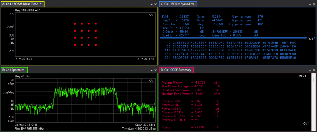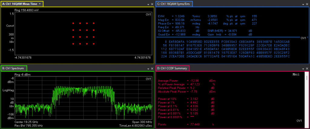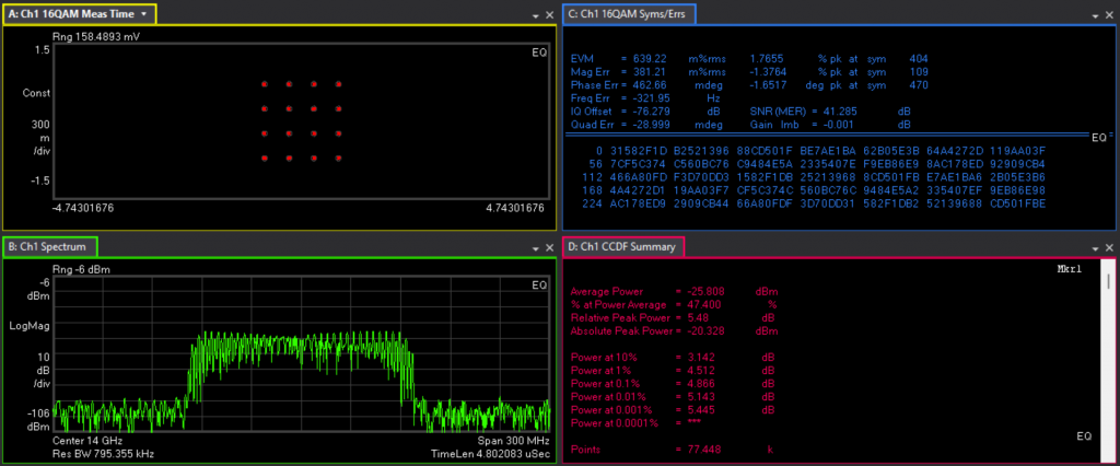 It can be seen that the converter can convert a signal at 14GHz, 19GHz, 12.5GHz and 30GHz with EVM of 41.2dB, 35dB, 30dB and 31dB respectively.