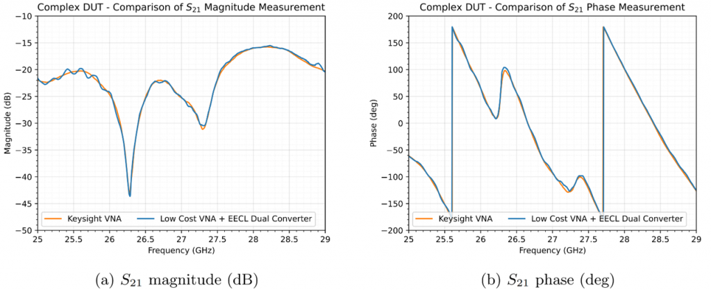 This allows an extremely low-cost measurement system to be used with practically identical measurement quality. The plot below shows our Dual Converter with a Low-Cost Low-Frequency VNA, compared to a High-Cost Keysight VNA. For more information on this VNA frequency extension technique, please consult EECL Application Note AN2501, available below: