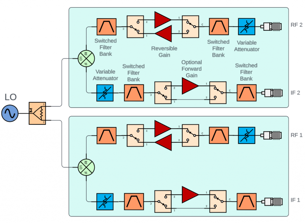 The Local Oscillator (LO) is highly versatile, supporting a range from 8 GHz to 32 GHz with a 1 MHz step resolution. The system supports both up-conversion and down-conversion across the following frequency ranges: