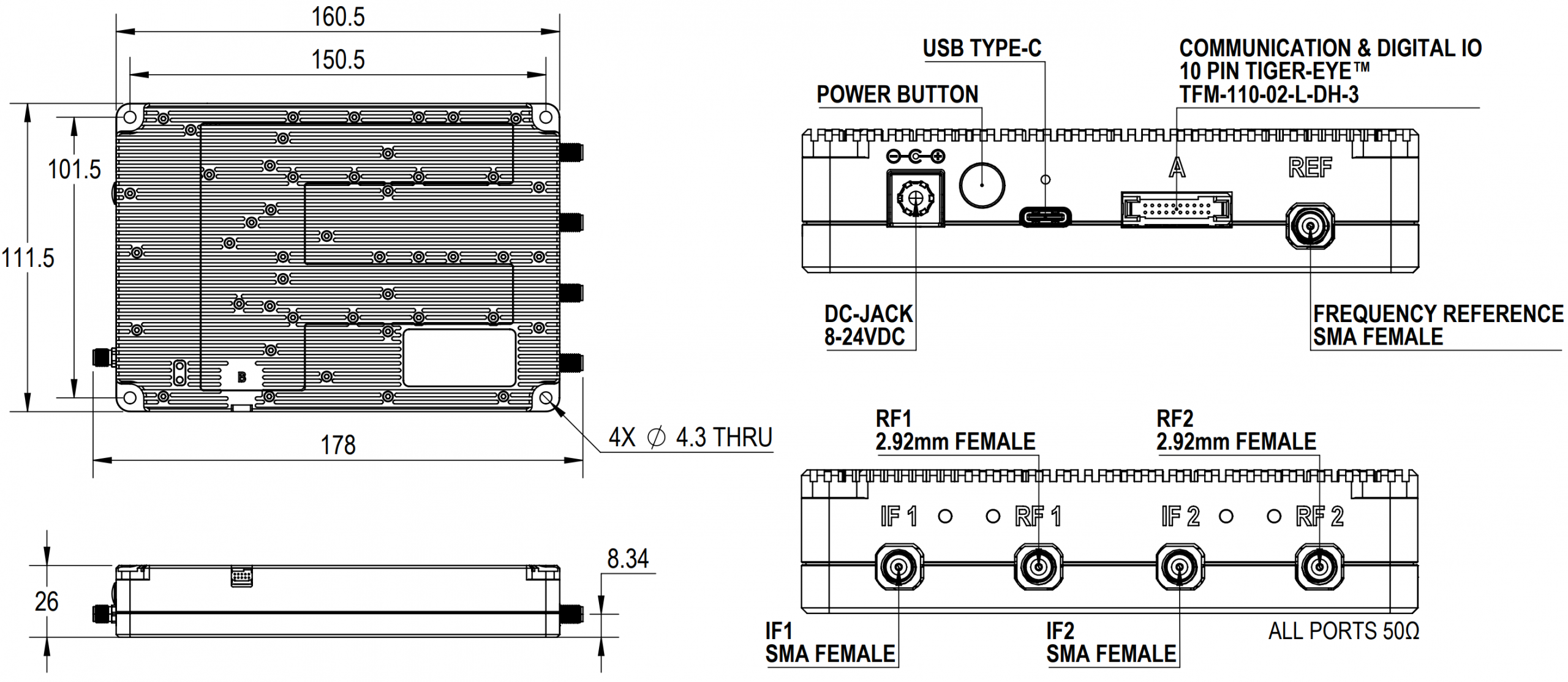 The RF port has a 0, 16, 32 or 48dB selectable attenuator and it is capable of handling high input powers up to 26dBm whilst maintaining linearity.Â