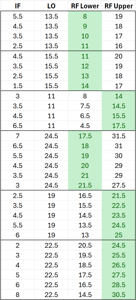 While the system supports any mathematical combination of these frequencies, we recommend using the configurations provided in the table below to ensure optimal performance and maximum spur/image suppression.